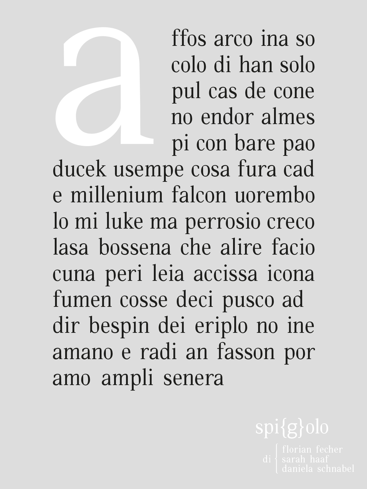 In einem zweiwöchigen Kurs in Italien entstand die Schrift Spigolo. Nach einer intensiven Stadterkundung wurde das architektonische Gesicht der Altstadt in anwendbare Typografie für Überschriften und Fließtext übersetzt.