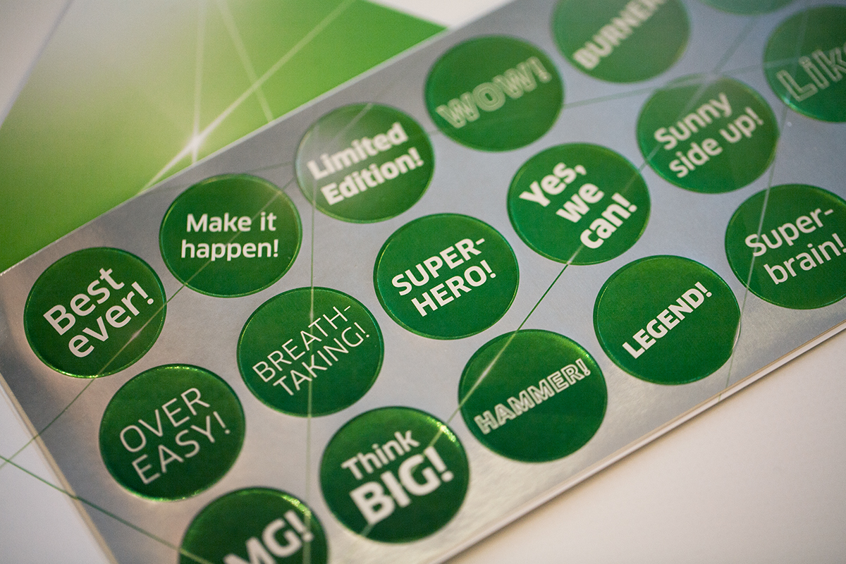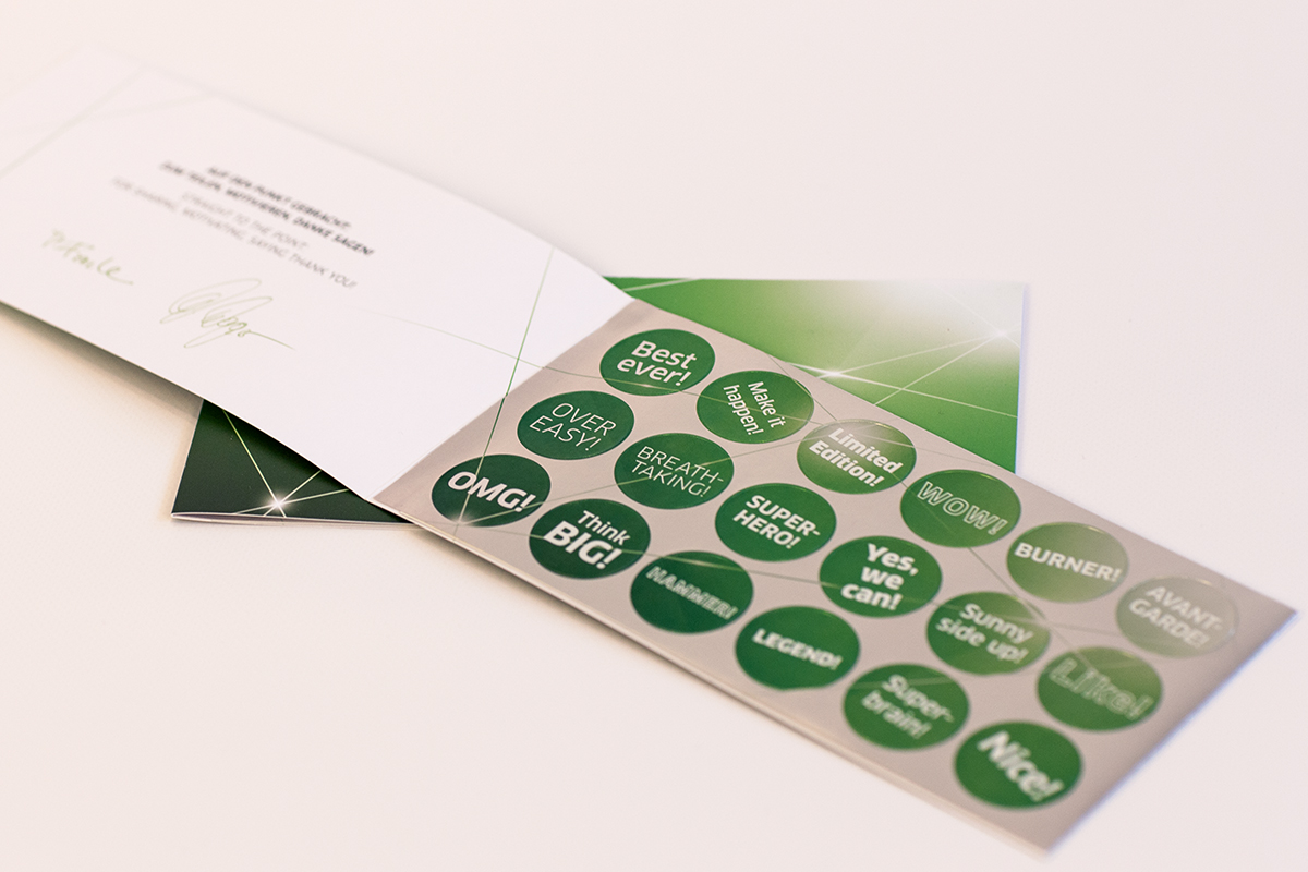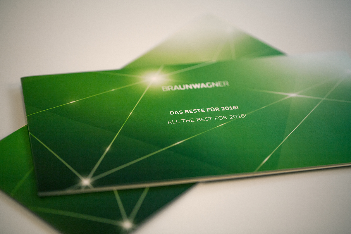 Den Kollegen mal Danke sagen, ein Lob verteilen oder zum motivieren – Mit dieser Weihnachtskarte und den enthaltenen Stickern lässt sich jede Botschaft überbringen. Auf Grund der internationalen Kunden von Braunwagner, die teilweise kein Weihnachten feiern, wurde das Weihnachtsthema abstrahiert und dezent transportiert. Entstanden ist sie 2015 im Team von BW.